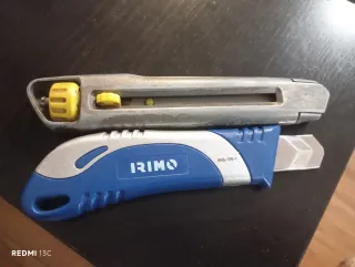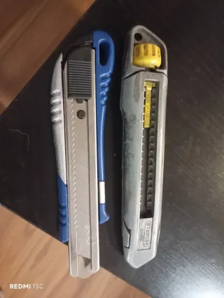 Dos cúteres, uno de la marca Stanley y otro de color azul, marca Irimo. - Cúter Stanley con mecanismo de bloqueo. Usado. - Cúter Irimo nuevo.