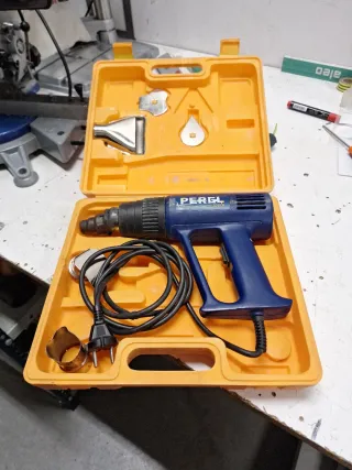 Pistola de calor PEREL en su maletín original con varios accesorios. - Maletín de plástico naranja. - Boquillas de diferentes formas. - Cable de alimentación.