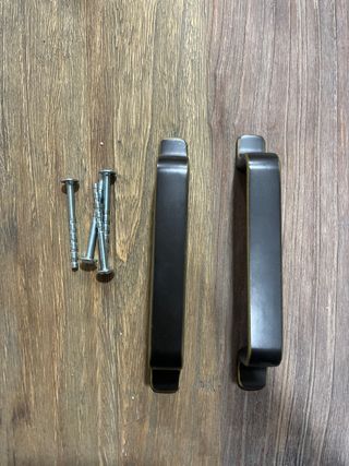 Dos tiradores de estilo moderno para cajones o muebles. Su diseño es elegante y funcional. - Color: Negro/Bronce. - Material: Metal. - Incluye tornillos para su instalación.