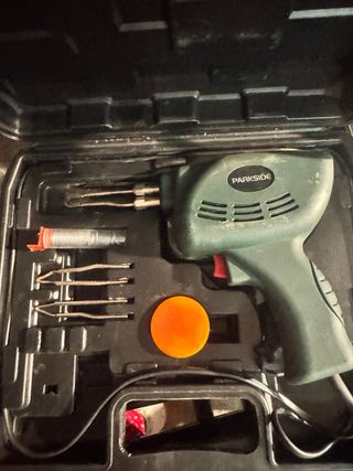 Pistola de soldar de la marca Parkside, ideal para trabajos de electrónica. - Incluye varios accesorios para diferentes tipos de soldadura. - Viene en su maletín original para un fácil almacenamiento y transporte.