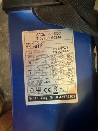 Máquina de soldar inversora modelo 150 VP. - Modelo: 150 VP - Número de serie: 106611 - Fabricada en ECC - Cumple normativas EN 60974-1 y EN 60974-10 - Tensión de entrada: 230V - Protección IP 23S - Refrigeración AF