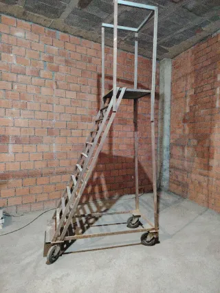 Escalera metálica de almacén con plataforma superior y ruedas para facilitar su movilidad. - 65 ancho x149 fondo x 314 altura - Construcción robusta en metal. - Plataforma de trabajo en altura. - Base con ruedas para desplazamiento.