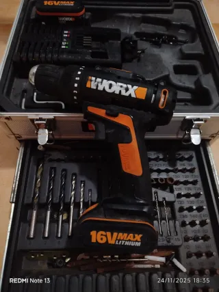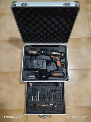 Taladro eléctrico inalámbrico de la marca Worx, modelo 16V MAX LITHIUM. Incluye su maletín con accesorios. - Taladro con batería de litio. - Maletín de transporte. - Incluye brocas y puntas de diferentes tipos.
