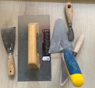 Herramientas para trabajos de yeso y construcción. - Rascador de yeso nuevo - Dos llanas de diferentes tamaños. - Helicóptero pequeño.