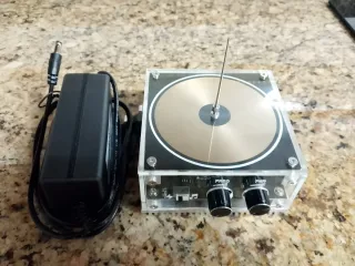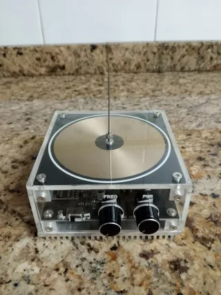 Torre Tesla con fuente de alimentación. - Diseño en acrílico transparente. - Bobina circular dorada. - Antena metálica. - Dos perillas de control frontales.