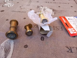 Tres mirillas para puerta en color dorado. Se encuentran en buen estado. - Tres mirillas de diferentes tamaños. - Material: metal dorado. - Ideales para mejorar la seguridad del hogar.