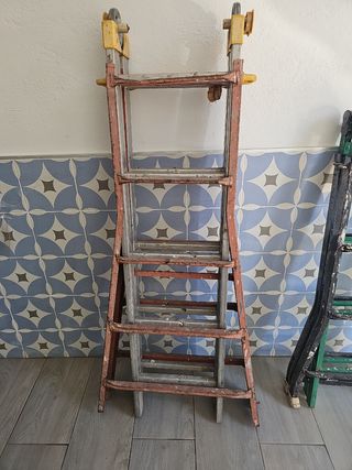 Escalera plegable de color verde, ideal para tener en casa o para trabajos puntuales. Su diseño permite guardarla fácilmente. - Estructura de madera. - Peldaños resistentes.