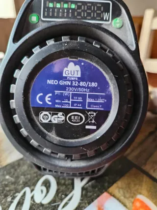 Bomba de agua de la marca GUT PUMPS, modelo NEO GHN 32-80/180. - Voltaje: 230V. - Frecuencia: 50Hz. - Potencia P1 (W): Mínimo 10W, Máximo 130W. - Temperatura de trabajo TF 95. - Presión máxima: 1.0MPa. - Clase de aislamiento: F. - Protección IP44.