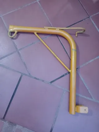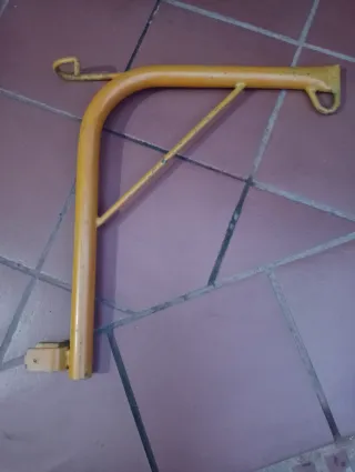 Garrucha de metal amarillo, diseñada para poleas y andamios. Su estructura curva y el soporte inferior permiten su fijación. 60x50x4 grosor tubo. Precio ya ajustado. - Material: Metal resistente - Color: Amarillo - Diseño: Curvo con soporte de fijación