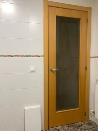 Puerta de interior con acabado en haya vaporizada y cristal. Marco de 11 cm de ancho. Y 76 x 206 exterior. Paso de 70. - Diseño acristalado. - Apertura a la derecha. Esta desmontada con marco, jambas y herrajes, (manillas, bisagras, cerradura).