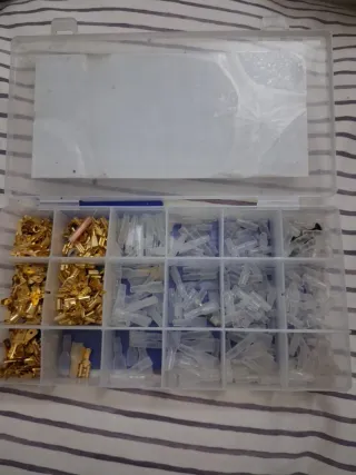 Kit de 300 terminales conectores de cable, tanto machos como hembras, para diversas aplicaciones eléctricas. - Incluye terminales de 2.8mm, 4.8mm y 6.3mm. - Material: latón y plástico. - Color: dorado y transparente. - Fundas aislantes incluidas para cada tamaño. - Dimensiones de la caja: 210 x 110 x 30mm.