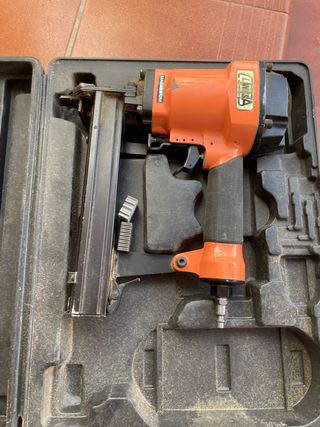 Clavadora neumática para chapa corrugada, en buen estado. - Ideal para trabajos de construcción y bricolaje. - Incluye estuche de transporte. - Marca: (marca visible en la imagen)