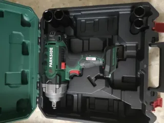Atornillador de impacto Parkside con batería de 20V y 400Nm de par. - Incluye maletín de transporte. - Incluye vasos. - Sin cargador ni batería.