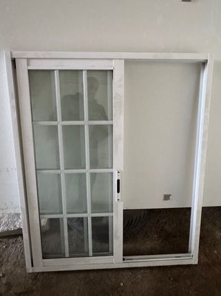 Ventana corredera de aluminio con doble acristalamiento Climalit y diseño de palillería interior. - Marco de aluminio blanco. - Vidrio Climalit. - Diseño de cuadrícula interior.