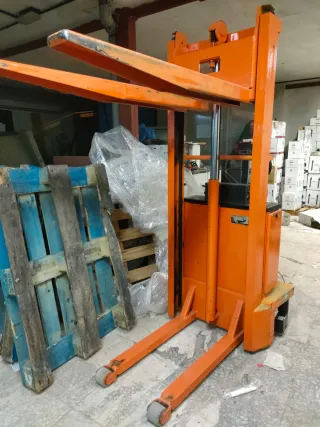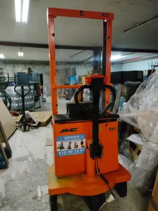 Transpaleta elevadora eléctrica modelo G100. - Color naranja. - Marca EUROLOGAR S.L. - Con ruedas para fácil desplazamiento. Batería recién puesta nueva