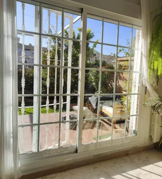 Puerta corredera de aluminio blanco con cristales, ideal para terrazas o patios. - Estructura de aluminio blanco. - Paneles de cristal. - Diseño de rejas. OPCIONAL SE ENTREGA CON PERSIANA