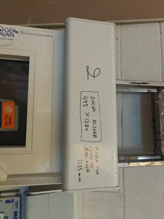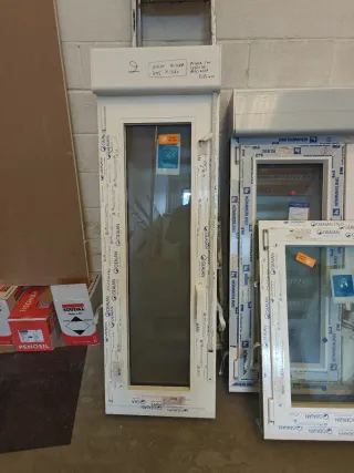 Ventana de PVC marca Gealan, modelo Linear. Sus medidas son 495mm de ancho por 1380mm de alto. - Marco de PVC blanco int madera ext - vidrio 4 Mate/16 Argon/6 bajo emisivo con persiana integrada. - 1 hoja practicable y oscilobatiente - Medidas totales con cajón de persiana: 1535mm.