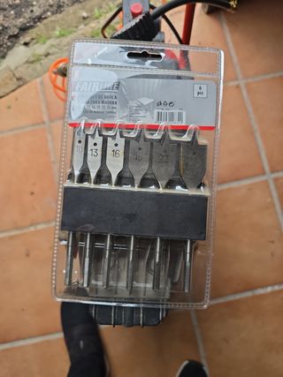 Juego de brocas para madera de la marca Fairline. Están nuevas. - Incluye 6 brocas de diferentes diámetros: 10, 13, 16, 19, 22 y 25 mm. - Fabricadas con material sintético de alta calidad. - Vienen en su blíster original.