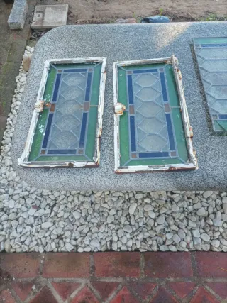 Conjunto de dos vidrieras emplomadas con marco blanco y detalles en verde y azul.22x45 4 vidriera emplomada 2 de cada foto 46 x125 - Diseño geométrico. - Marco con acabado blanco desgastado. - Cristales de colores azul y verde.. Muy antiguas,para pequeña restauracion