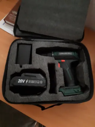 Taladro atornillador inalámbrico en su maletín. - Incluye taladro, batería y cargador. - Diseño ergonómico en color verde y negro. - Marcado CORDLESS DRILL en el cuerpo.