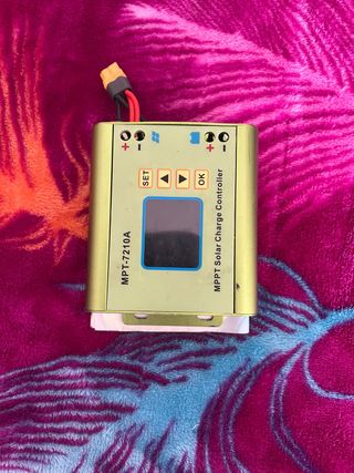 Controlador de carga solar MPPT, modelo MPT-7210A. Diseñado para optimizar la carga de baterías con paneles solares. - Carcasa metálica dorada. - Pantalla LCD. - Botones de control: SET, flechas y OK. - Conexiones para panel solar y batería.