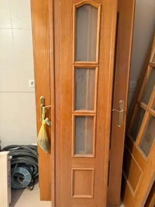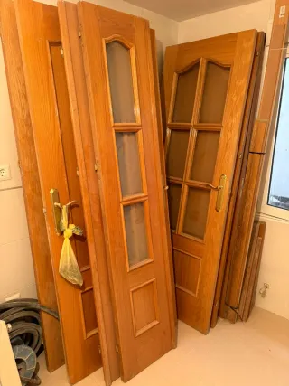 Conjunto de puertas de interior de madera con detalles de cristal, también las hay sin cristal. De varias medidas, de 62 y 72 y también alguna grande de salón, 75€ cada una. Hay 9 puertas si las llevas todas se hace precio. También se entregan las jambas. Preguntar sin compromiso para más información