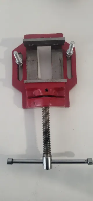 Mordaza de sujeción para taladro, de color rojo. - Cuerpo metálico. - Tornillo de ajuste con manivela. - Placas de sujeción. - Dos pernos de fijación. - Hierro forjado, para sujetar piezas de forma segura, evitando movimientos accidentales. - Apertura 8 cms.