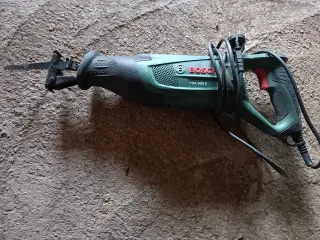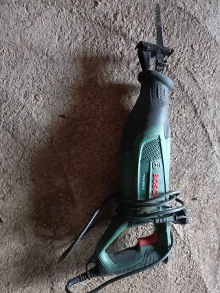 Sierra de sable eléctrica marca Bosch, modelo PSA 900 E. Herramienta versátil para cortes. - Color verde y negro. - Empuñadura ergonómica. - Hoja de sierra incluida.