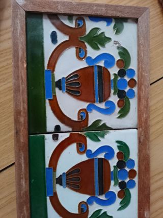 Antigua pareja de azulejos enmarcada. Cerámica vidriada de Triana, Sevilla. Hecho y pintado a mano. Medidas: 30 cm largo x 16 cm ancho x 2 cm grosor. Más antigüedades y artículos originales en mi perfil Instagram: @almadecolibri13 WhatsApp: 679658776