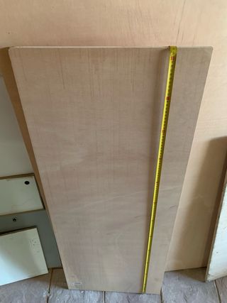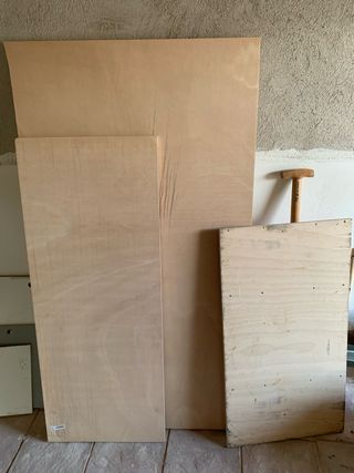 Lote de madera contrachapada y varios retales. - Ideal para proyectos de fuegoneta - Piezas de diferentes tamaños y grosor de 15mm - Los dos tableros grandes están sin usar y el tablero pequeño está usado y tiene las medidas de 90x50mm Se encuentran en Terrinches