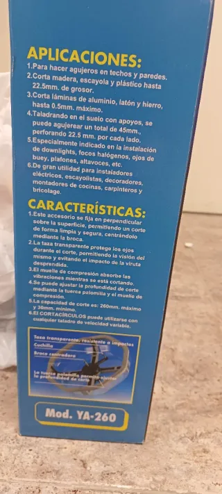 Accesorio para taladro modelo YA-260. - Permite hacer agujeros en techos y paredes. - Corta madera, escayola y plástico hasta 22.5mm. - Corta láminas de aluminio, latón y hierro hasta 0.5mm. - Capacidad de corte: 260mm máximo y 30mm mínimo. - Taza transparente resistente a impactos. - Muelle de compresión que absorbe vibraciones. - Ajuste de profundidad de corte mediante tuerca palomilla.