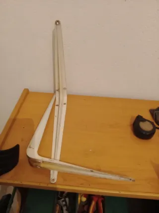 Conjunto de escuadras metálicas para estanterías. Son de color blanco y tienen un diseño clásico. - Material: Metal - Color: Blanco - Diseño: Escuadra - Cantidad: varias unidades. Precio 2 euros cada una Medidas. 30 por 25 ctm.
