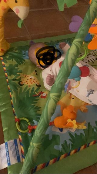 Mantita de juegos para bebé con un diseño de selva. - Incluye varios juguetes colgantes. - Colores vivos y alegres. - Superficie acolchada para mayor comodidad. Ideal para que tu bebe descubra y se entretenga, con sonidos divertidos para que interactúe y estimule.