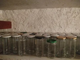 Conjunto de botes de cristal, perfectos para almacenar conservas caseras. - Ideales para mermeladas, legumbres, salsas y otros alimentos. - Hay unas 150 unidades de tarros.