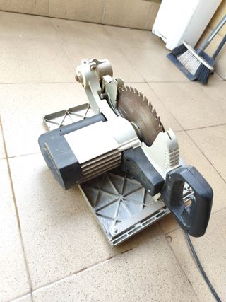 Sierra circular eléctrica para trabajos en madera. Cuenta con un diseño robusto y un mango ergonómico para un mejor agarre. - Base metálica. - Disco de sierra incluido. - Cable de alimentación. Sacada de un banco de trabajo.Carece de la plataforma superior por rotura. En la última fotografia se observa el brazo roto de la plataforma superior. La sierra funciona perfectamente. NO se envia debido al peso. Recoger en Corbera de Llobregat