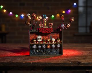 Expositor temático de Stranger Things, ideal para coleccionistas. - NO Incluye figuras Funko Pop. - Diseño inspirado en la serie. - Base con iluminación LED RGB con mando -Arboles y reloj incluidos