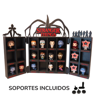 Expositor de pared para figuras Funko Pop de Stranger Things. Incluye soportes. 🎨 Diseño temático inspirado en Stranger Things: ideal para mostrar tus figuras - Diseño inspirado en la serie. - Incluye Soportes para figuras que no se aguantan de pie. - Nombre de ONCE/ELEVEN en ESPAÑOL e INGLES Figuras no incluidas - Diseño inspirado en Stranger Things. - Capacidad para múltiples figuras. - Soportes incluidos para montaje. - Diseño inspirado en la serie. - Espacio para múltiples figuras. - Incluye nombres de personajes en cada compartimento.