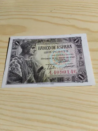 Billete de una peseta del Banco de España con fecha de Madrid del 21 de mayo de 1943. - Diseño con retrato. - Número de serie: 14090146.