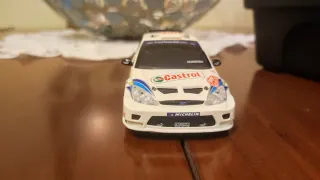 Coche de slot Ford Focus 2 de la marca SCX. Sin bandeja de pilotos, cristales "tintados" con cinta aislante. En buen estado, único defecto pequeña grieta en la luna delantera - Réplica detallada del modelo de competición. - Decoración con patrocinadores como Castrol y Michelin.