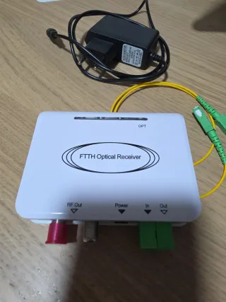 Receptor óptico FTTH con entrada para CATV. Incluye adaptador de corriente y cable fibra