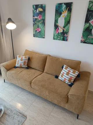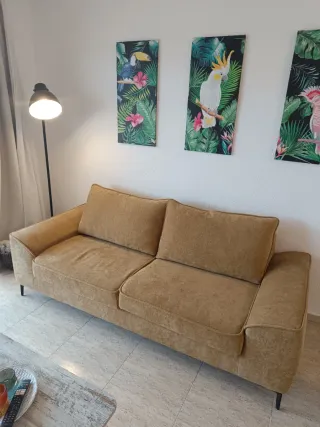 Vendo sofá de tres plazas (formato de 2 cojines grandes), color amarillo mostaza. Está prácticamente nuevo, comprado el verano pasado y en perfecto estado, muy poco uso. Medidas: Ancho: 221 cm Fondo: 96 cm Alto: 86 cm Patas metálicas en color negro, estilo moderno e industrial. Muy cómodo y con un diseño actual que aporta mucha luz al salón. 📦 Motivo de la venta: mudanza 🚚 Recogida: a cargo del comprador ❗ Transporte NO incluido ⚠️ Imprescindible vehículo suficientemente grande para llevárselo Cualquier duda, ¡escríbeme sin compromiso!