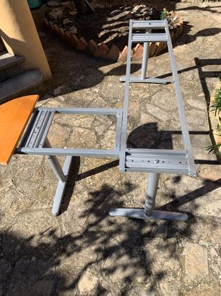 Conjunto de patas y base para mesa de escritorio de gran tamaño. Ideal para crear tu propio espacio de trabajo.Estructura para mesa de despacho, o escritorio, para una tabla de 2metros de ancho y 80 de fondo en la parte estrecha y hasta 110cm en la parte más ancha y 3 patas, regulables en altura. puede presentar alguna pelada, tiene los signos propios del paso del tiempo, pero en buen estado general. El tablero no incluido, aunque pongo última foto para que se pueda ver como queda - Estructura metálica robusta. - Base estable para mayor seguridad. - Acabado en color gris.