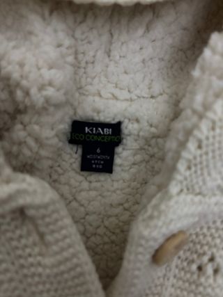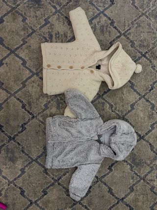 Pack de dos chaquetas para bebé, una de punto color crema y otra de pelo sintético gris. - Chaqueta de punto color crema con botones. - Chaqueta de pelo sintético color gris con cremallera. Marcas: Kiabi y Carrefour en excelente estado