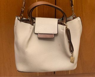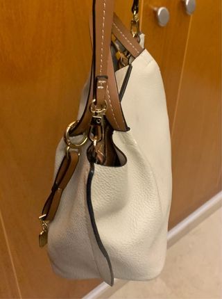 Bolso de mano Parfois (2025) efecto cuero. Color blanco con detalles en marrón. Asa corta con gancho tipo mosquetón para colgar asa larga.