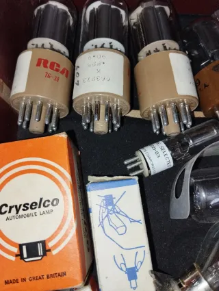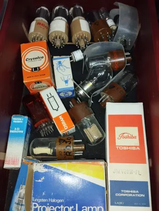 Lote variado de componentes electrónicos, incluyendo tubos de vacío y lámparas halógenas de diferentes marcas. - Tubos de vacío RCA, Cryselco, OSRAM. - Lámparas halógenas Corona 12V. - Lámpara Toshiba J12V20W-FL. - Lámpara Tungsten Halogen Projector Lamp.