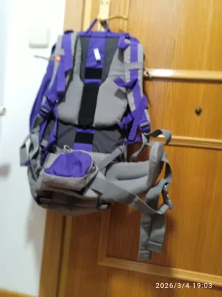 Mochila de senderismo Quechua de 50 litros, ideal para excursiones y viajes. - Color gris y morado. - Compartimento principal amplio. - Correas ajustables para mayor comodidad. Solo se ha usado una vez No pesa tanto entre dos o tres kgs. Mi zona es Carabanchel
