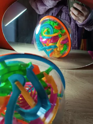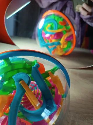 Desafía tu mente con este laberinto 3D. - Esfera transparente. - Laberinto interior con múltiples niveles y caminos. - Piezas de colores vibrantes: azul, verde, naranja, rosa y amarillo. Me vino ya con un tornillo suelto.
