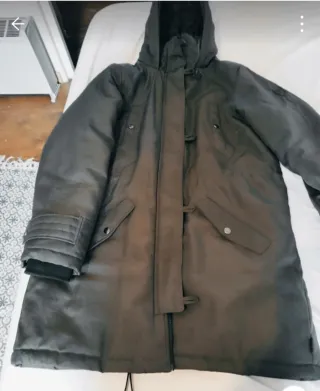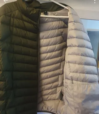 Abrigo acolchado de color verde oliva, ideal para protegerse de la lluvia y el frío. - Diseño impermeable. - Capucha integrada. - Cierre de cremallera. - Bolsillos frontales con botón.