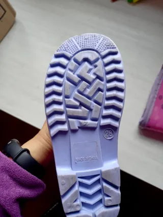 Botas de agua para niña con un divertido diseño de Minnie Mouse. - Talla 28. - Color rosa con lunares. - Borde superior morado.