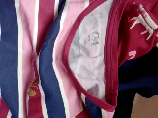 Conjunto de tres vestidos para niña en talla 6. - Vestido de fondo granate con estampado de unicornios y arcoíris. - Vestido de rayas rosas, granates y azules con detalle de lazo dorado. - Vestido azul marino con estampado de gatito, flores y mariposas.